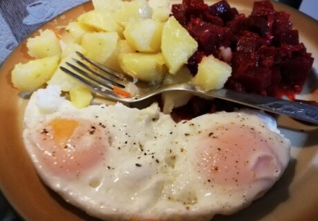Menu środa: 1. Kanapki u babci. 2. Jajko, ziemniaki, kapusta gotowana. 3. Racuchy z jabłkami u babci. W tym tygodniu logistycznie wspiera mnie babcia chłopaków. Więc są kanapki – chłopcy buszują po kuchni, wyszukując różne smakołyki, i większości samodzielnie komponując zawartość talerzy. Obiad. Gdy trzeba działać szybko, podsmażenie wczorajszych ziemniaków,więcej